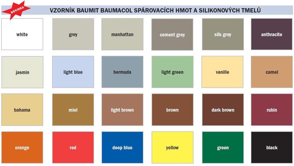 - spotřeba: cca 0,5–0,9 kg/m2 - 24 barevných odstínů vč. odstínů sytých - Pro tloušťky 1-8 mm - Součást certifikov. řešení pro balkóny a lodžie U obkladových obkladových prvků menších rozměrů a větších tlouštěk (např. Klinker pásky) je předpoklad spotřeby větší a je tak nutné její ověření. Orientační hodnoty v závislosti na formátu lepeného prvku jsou zároveň uvedeny v tabulce spotřeb spárovací hmoty, která je vyobrazena v Technologickém předpisu Baumit Baumacol – systém lepení obkladů a dlažeb.