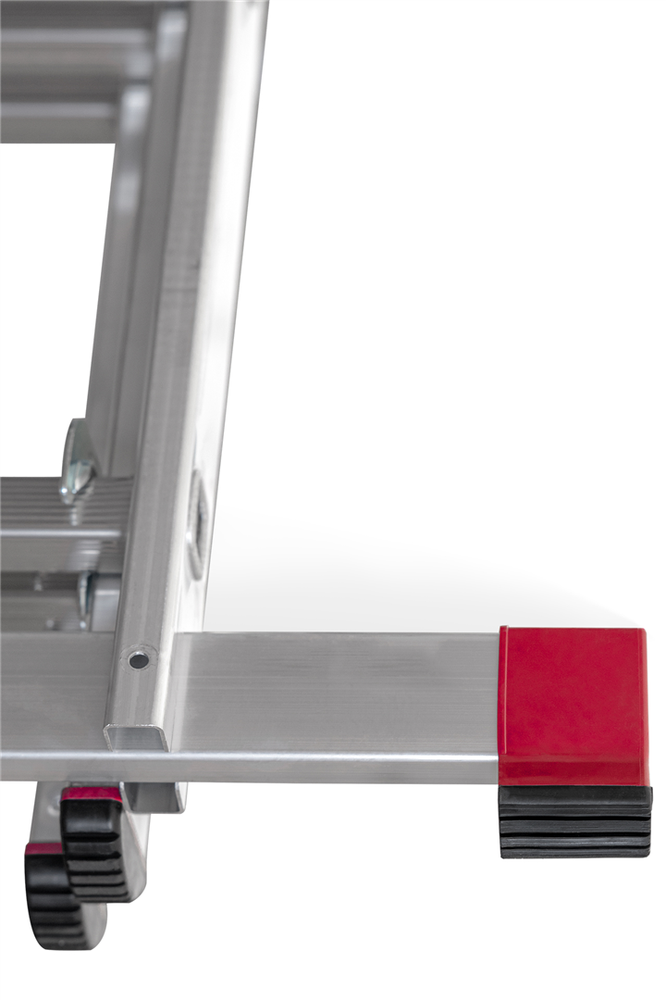 Základna žebříku je zakončena gumovými patkami a celá konstrukce je vyztužena širokými stabilizátory. Takováto řešení rozhodně zvyšují bezpečnost uživatele. Důležitým prvkem je také pojistka proti samovolnému rozložení žebříku.