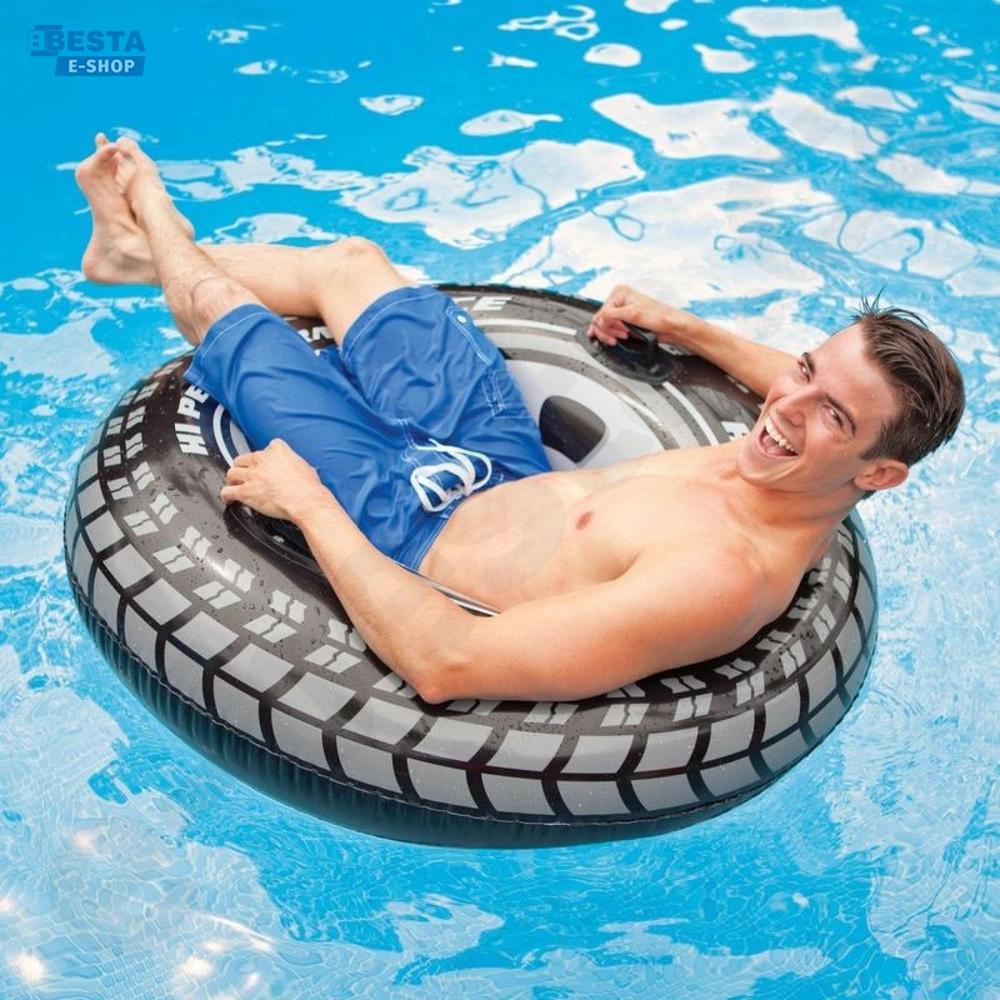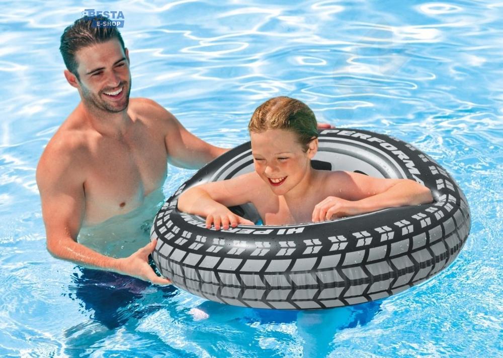 Plovací kruh Pneumatika, vyrobený z odolného vinylu, průměr 91 cm, dva úchyty na horní straně hruhu, pro děti od 9 let.
