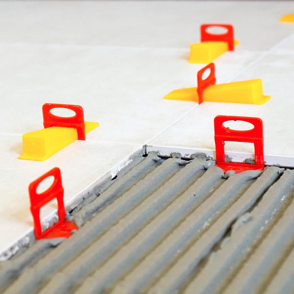 Plastové klíny značky LEVELYS světle oranžové barvy vyvíjejí na dlaždice silný a rovnoměrný tlak během doby tvrdnutí lepidla, čímž eliminují jakýkoliv pohyb mezi jednotlivými dlaždicemi.