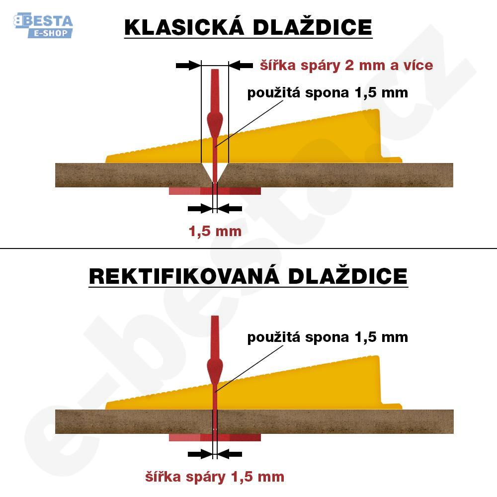 - při rektifikované dlaždici (kde hrany dlažby nebo obkladu jsou řezané do 90 °, tj pravého úhlu) bude výsledná spára stejná, jako šířka spony. Například pokud použijete 1,5 mm sponu LEVELYS při rektifikované dlaždici, tak výsledná spára bude také 1,5 mm.