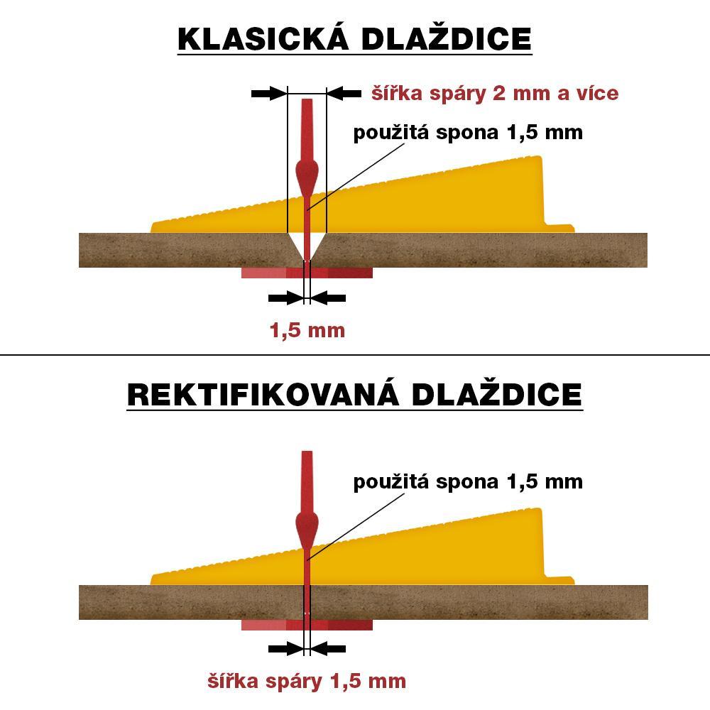 - při rektifikované dlaždici (kde hrany dlažby nebo obkladu jsou řezané do 90 °, tj pravého úhlu) bude výsledná spára stejná, jako šířka spony. Například pokud použijete 1,5 mm sponu LEVELYS při rektifikované dlaždici, tak výsledná spára bude také 1,5 mm.