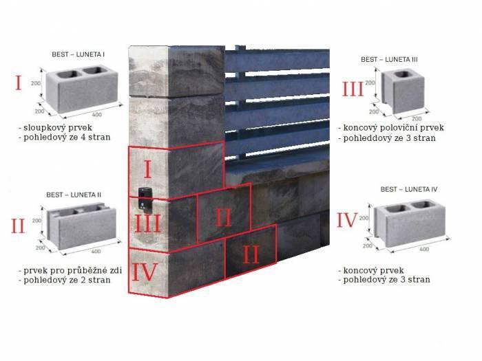 Jednotlivé typy prvků BEST – LUNETA jsou navrženy tak, aby vám zjednodušily práci a navzájem se doplňovaly. Při stavbě plotu se kladou tvarovky podobně jako cihla na vazbu, spára nesmí probíhat ve více řadách nad sebou.