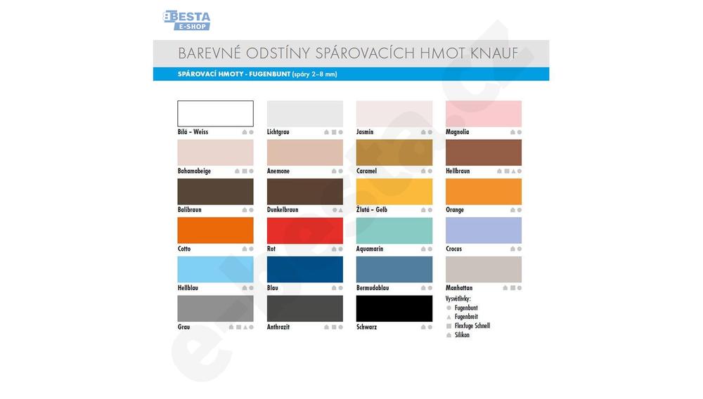 Je dostatečně pružná, aby přenesla změny teplot podlahového vytápění i objemové změny velkoformátových dlaždic a obkladů. Snížená nasákavost a zvýšená alkalita hmoty brání růstu plísní a řas na jejím povrchu. Směs se snadno aplikuje do spár , aniž by vytékala a při následném čištění spár jde velmi lehce odstranit z povrchu obkladového prvku. Široká škála barevných odstínů odpovídá sanitárním silikonům KNAUF.