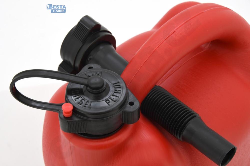 Plastový kanystr na PHM, objem 5 litrů, včetně 17 cm dlouhé nálevky.
