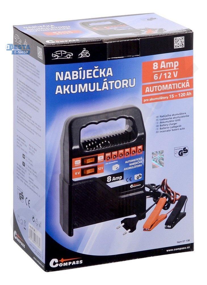 Automatická nabíječka autobaterií, maximální nabíjecí proud 8 A, aritmetický nabíjecí proud 6V pomalu/rychle = 2,5 A/5,6 (max. 8A), 12V pomalu/rychle 3,5/5,6A (max. 8A), homologace GS/TUV, pro olověné akumulátory 6/12 V s kapacitou 15-120 Ah, jištění proudového obvodu pojistkou, přepínač 6/12 V, tepelná pojistka proti přehřátí, led indikace provozu, napájení AC 220-240 V.