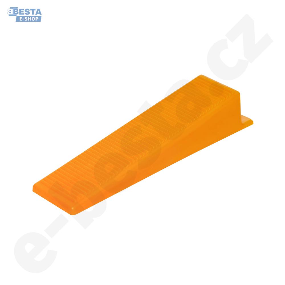 Plastové klíny značky LEVELYS světle oranžové barvy vyvíjejí na dlaždice silný a rovnoměrný tlak během doby tvrdnutí lepidla, čímž eliminují jakýkoliv pohyb mezi jednotlivými dlaždicemi.