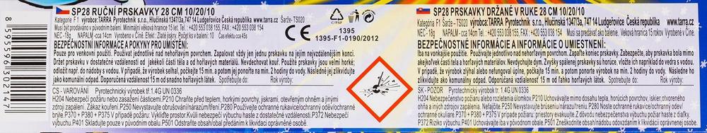 Zapalujte jednotlivě nad nehořlavým povrchem, po dohoření jsou prskavky stále horké, doporučujeme odložit například do sklenice s vodou, je nutné dodržovat bezpečnostní pokyny uvedené na obalu, baleno v papírovém sáčku, v balení 10 ks, délka prskavky 28 cm, prodej od 15 let.