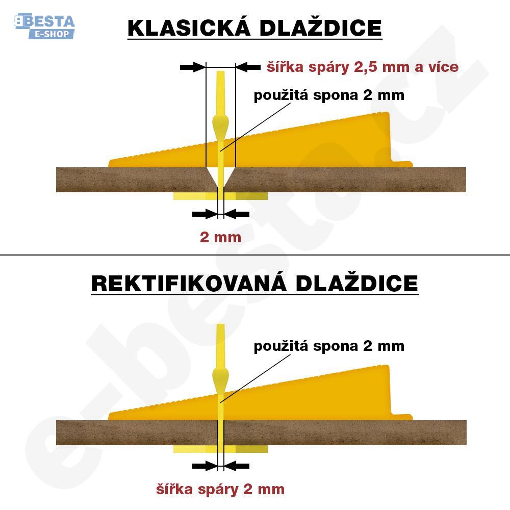 - při rektifikované dlaždici (kde hrany dlažby nebo obkladu jsou řezané do 90 °, tj pravého úhlu) bude výsledná spára stejná, jako šířka spony. Například pokud použijete 2 mm sponu LEVELYS při rektifikované dlaždici, tak výsledná spára bude také 2 mm.